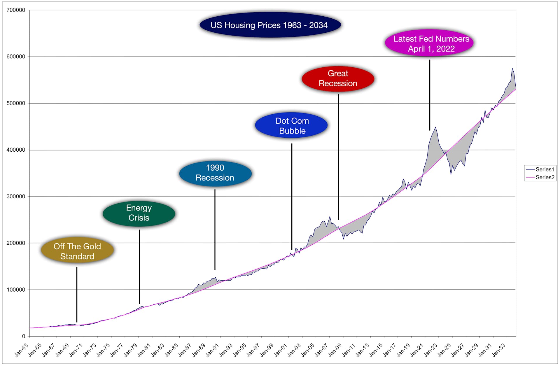 The St. Louis Federal Reserve Bank provides collections of relevant housing data from HUD (Housing an Urban Development) and the Census Bureau. I dropped in the pink trend line. The blue line is SLFRB’s median home price. These are the ups and downs of that indicator. Price changes are never a straight line. Some quarters saw prices increase, others had declines. Each data point is a quarter going back to 1963 (extending those points into the future I'll go into later). There are several prolonged periods in which the prices were consistently above the trend line or below it. I looked at five specific prolonged peaks and valleys: 1. Early 1970's - When the US left the Gold Standard, 2. The 1979 - 1980 Energy Crisis, 3. The 1990 Recession, 4. The 2001 Dot Com Bubble, and 5. The 2008 Great Recession.